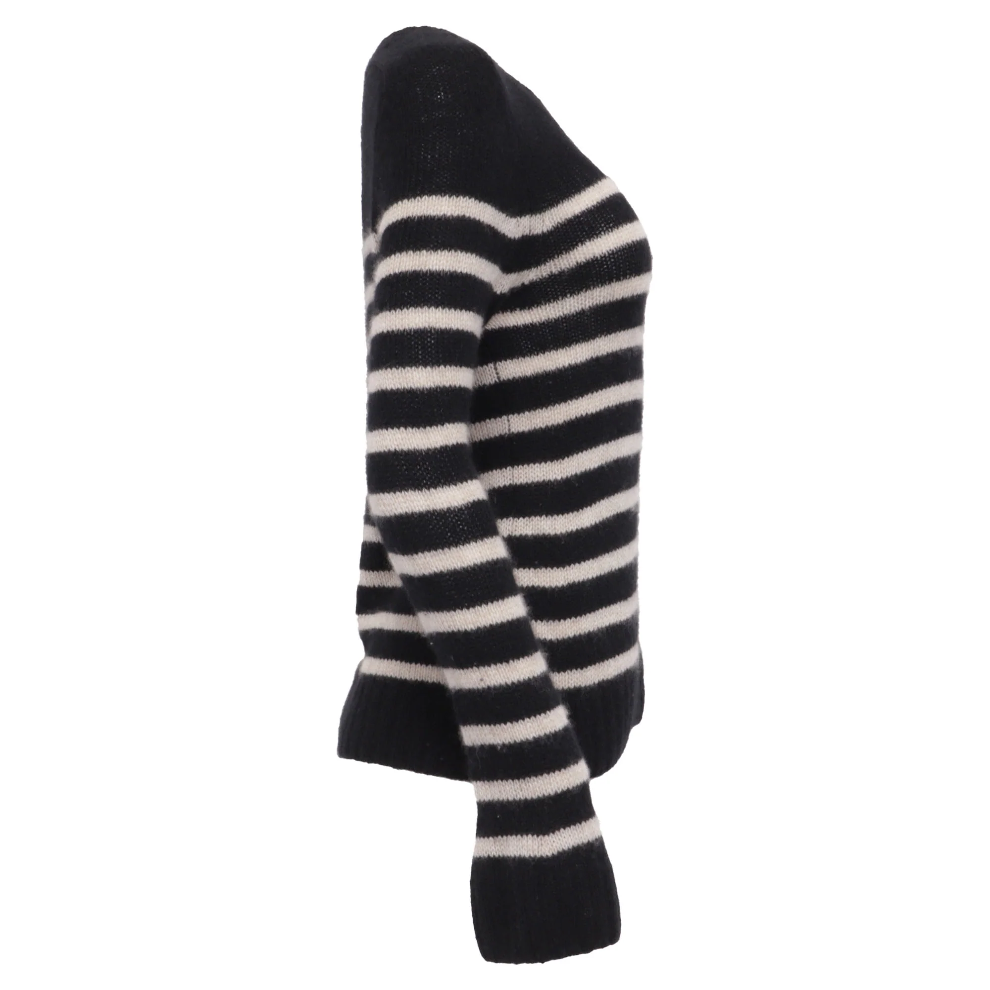The **Khaite Striped Crewneck Sweater** in black and white cashmere delivers timeless sophistication with its classic stripes and relaxed yet refined silhouette. Spun from ultra-soft cashmere, it offers exceptional warmth and luxurious comfort for everyday wear. Style it with high-waisted tailored trousers and loafers for effortless polish, or pair with straight-leg denim and ankle boots for chic, understated elegance. Khaite Tilda Striped Crewneck Sweater in Black and White CashmereCondition - Very goodSigns of wear - Minor signs of wear, minor peeling.Packaging - NoneColor - BlackMaterial - Wool/hair | cashmereSize - US4/SMeasurements - Length - 630; Chest - 860SKU - RFCPUUSCL708152W