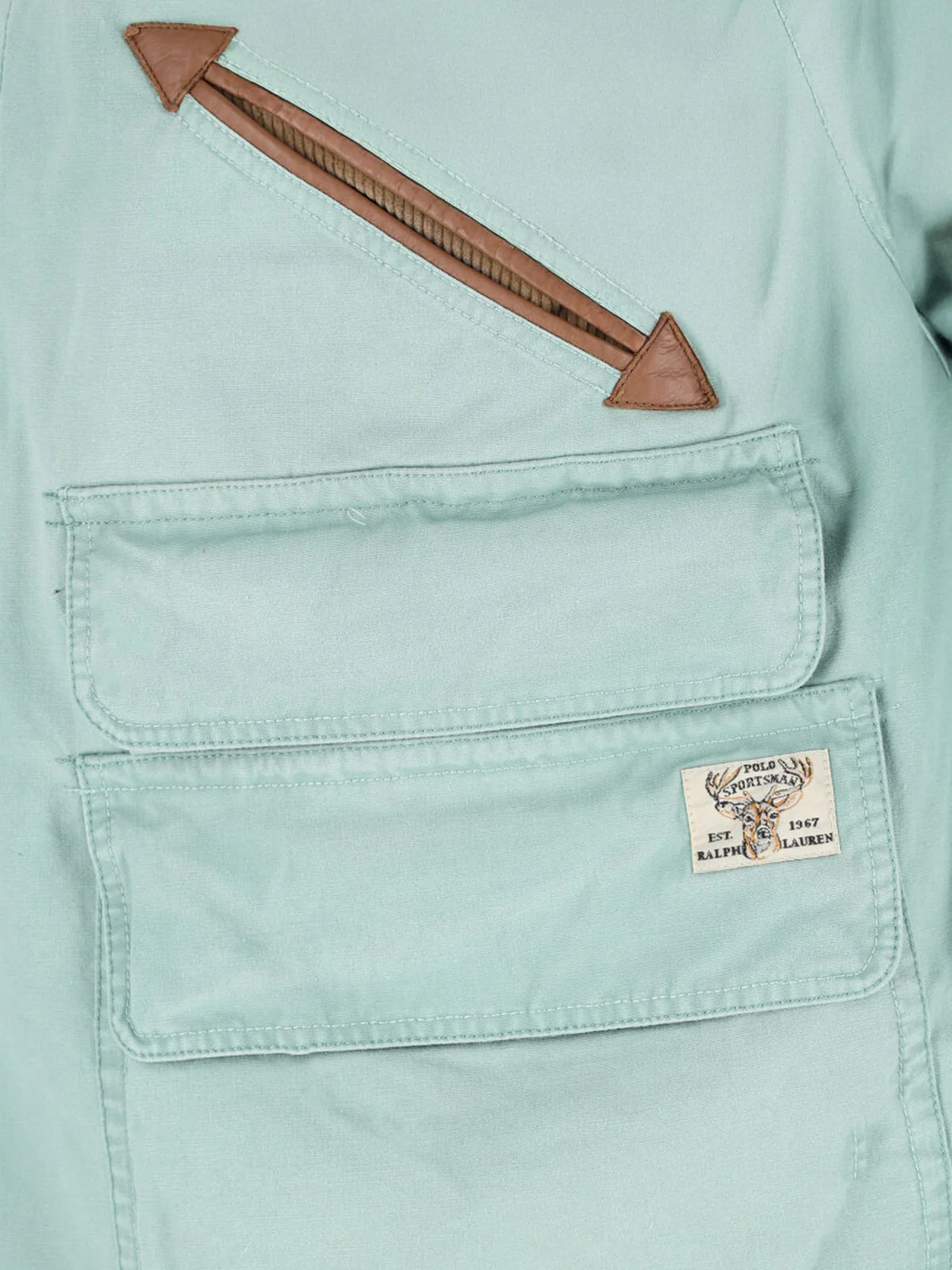 This military-style jacket from Polo Ralph Lauren features a mint green canvas body with a classic brown ribbed velvet collar. It includes a button closure, four front patch pockets, and two additional pockets with leather trim. The buttoned cuffs and straight hemline offer a refined finish, while the leather accents enhance its sophistication, making it a versatile piece for casual wear. - Mint green canvas body - Brown ribbed velvet collar - Button closure - Four front patch pockets - Two additional leather-trimmed pockets - Buttoned cuffs - Straight hemline