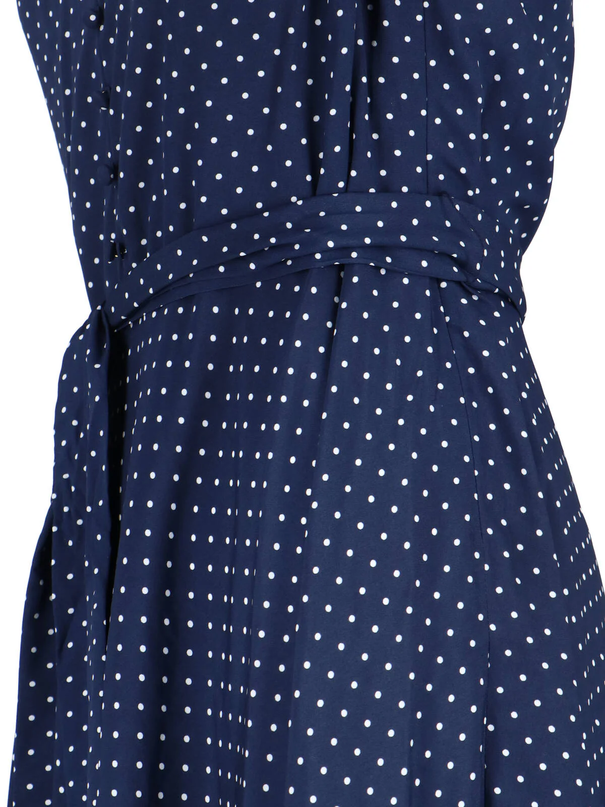This elegant midi dress embodies refined sophistication. Crafted from luxurious navy blue fabric, it showcases a playful all-over white polka dot pattern, balancing charm and contemporary style. The V-neckline and short sleeves with buttoned cuffs enhance its delicate design, while the button-down front and waist belt create a flattering silhouette. Finishing with a straight hemline, this piece is ideal for both casual and formal occasions, making it a versatile addition to any wardrobe. - Navy blue fabric - White polka dot pattern - V-neckline - Short sleeves with buttoned cuffs - Button-down front - Waist belt - Straight hemline