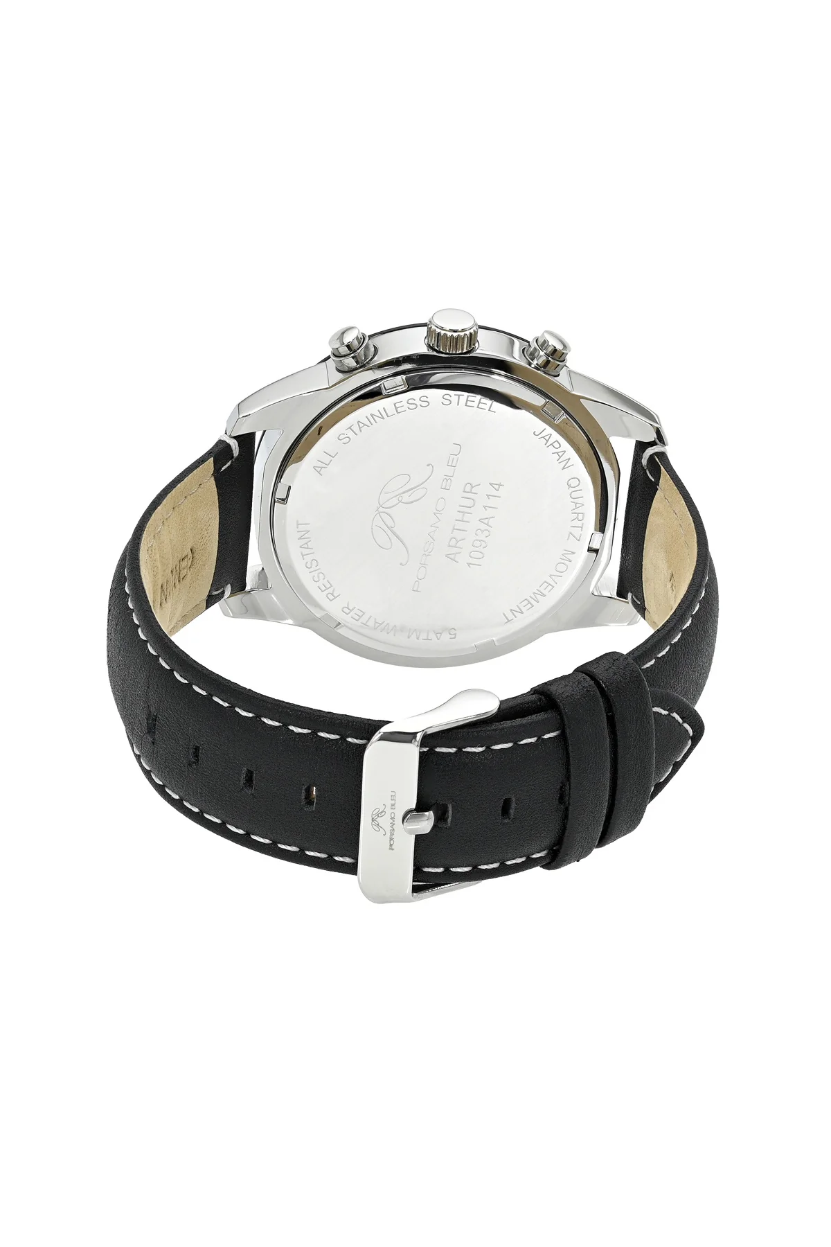 Porsamo Bleu Arthur Men's Chronograph Watch With Stainless Steel Case And Geniune Leather Band, Date Window Between 4 And 5 O'Clock; Silver Tone & Black