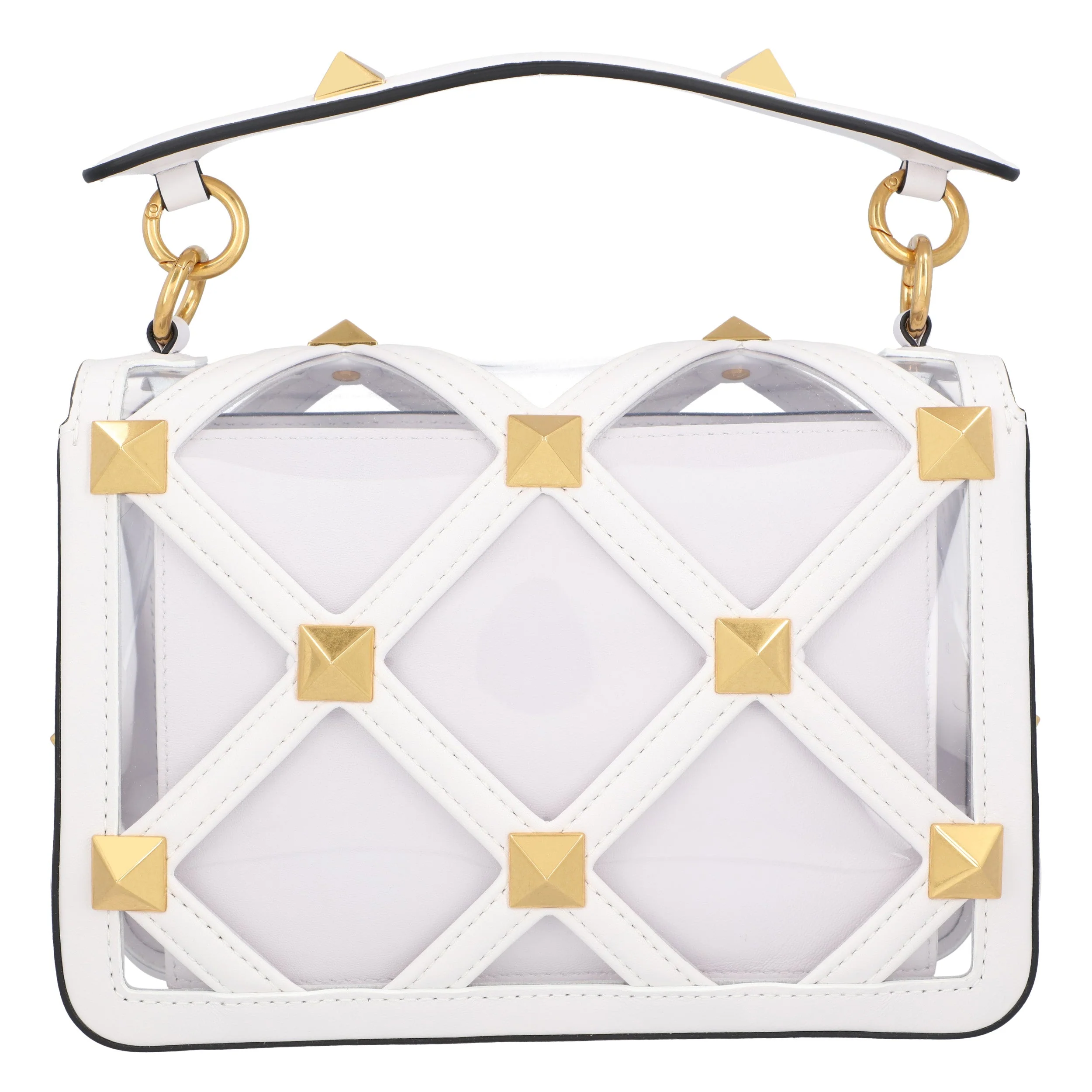 This stunning transparent Roman Stud shoulder bag from Valentino showcases a structured silhouette adorned with a geometric pattern of gold-tone studs. Crafted from premium clear PVC with elegant white leather accents, it offers versatility with a top handle and a detachable chain strap. A chic addition to any collection, this bag epitomizes modern luxury. - Material - 100% PVC, Leather - Size - W 23 x H 19 x D 7 cm - Origin - Made in Italy - Color - Trasparente/Bianco Ottico