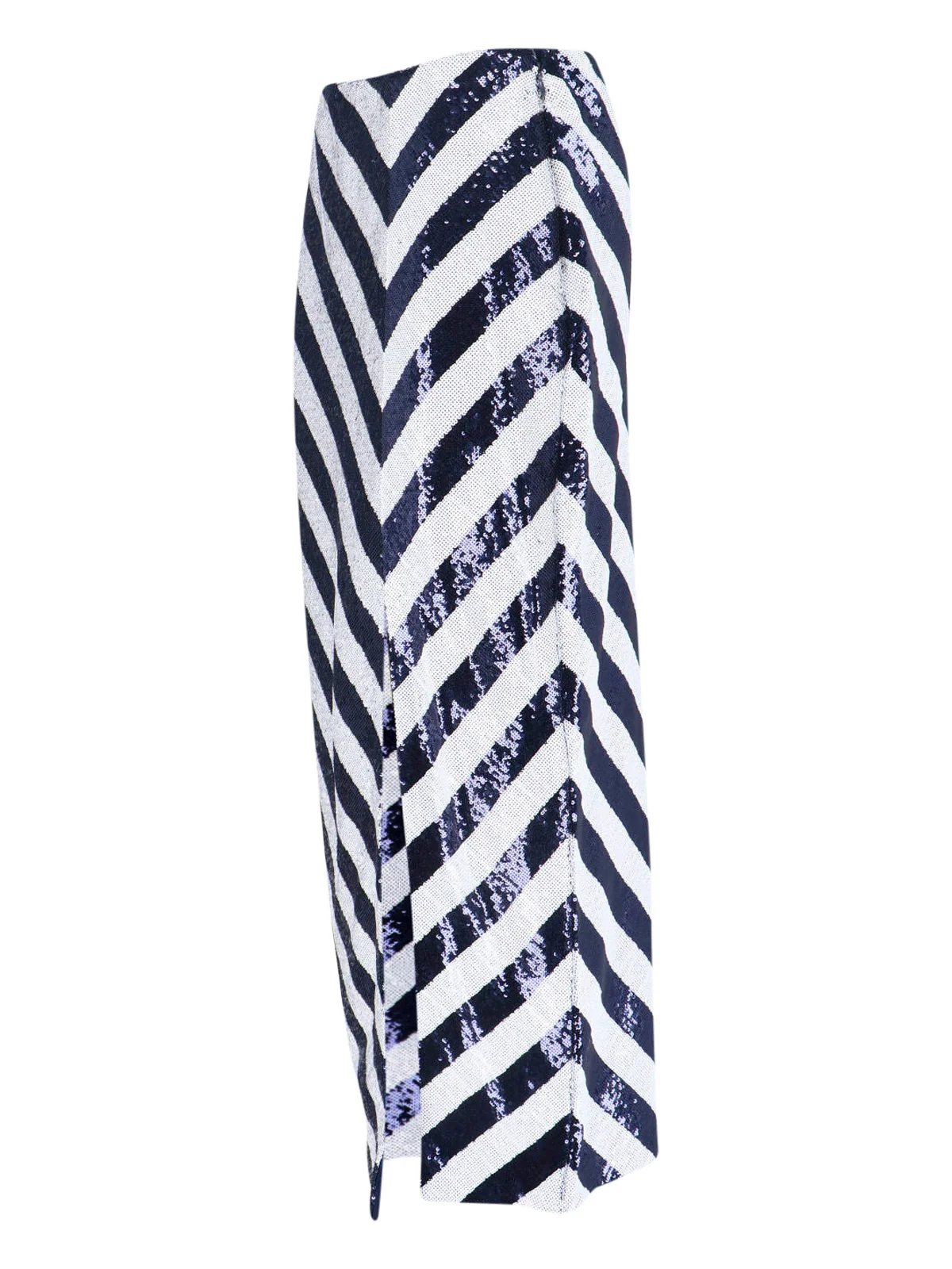 A midi skirt from Polo Ralph Lauren features an all-over sequin design with a chevron pattern in dark blue and white stripes. The high-waisted silhouette flatters the figure, complemented by a side zipper closure and a stylish side slit. The straight hemline enhances the sleek, shimmering look, perfect for luxurious occasions. - All-over sequin design - Chevron pattern in dark blue and white - High-waisted silhouette - Side zipper closure - Chic side slit - Straight hemline