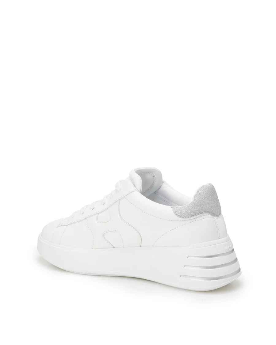 Hogan presents the Rebel H564, where a smooth white leather upper meets a striking shimmering silver heel tab, creating a contemporary aesthetic. The distinctive chunky platform sole ensures comfort and stability, enhanced by subtle grooves and a regular fit. These sneakers include a memory foam insole for superior cushioning and come with an addition of extra laces for versatility. Presented with a fabric dust bag for protection, they are ideal for a modern lifestyle.
